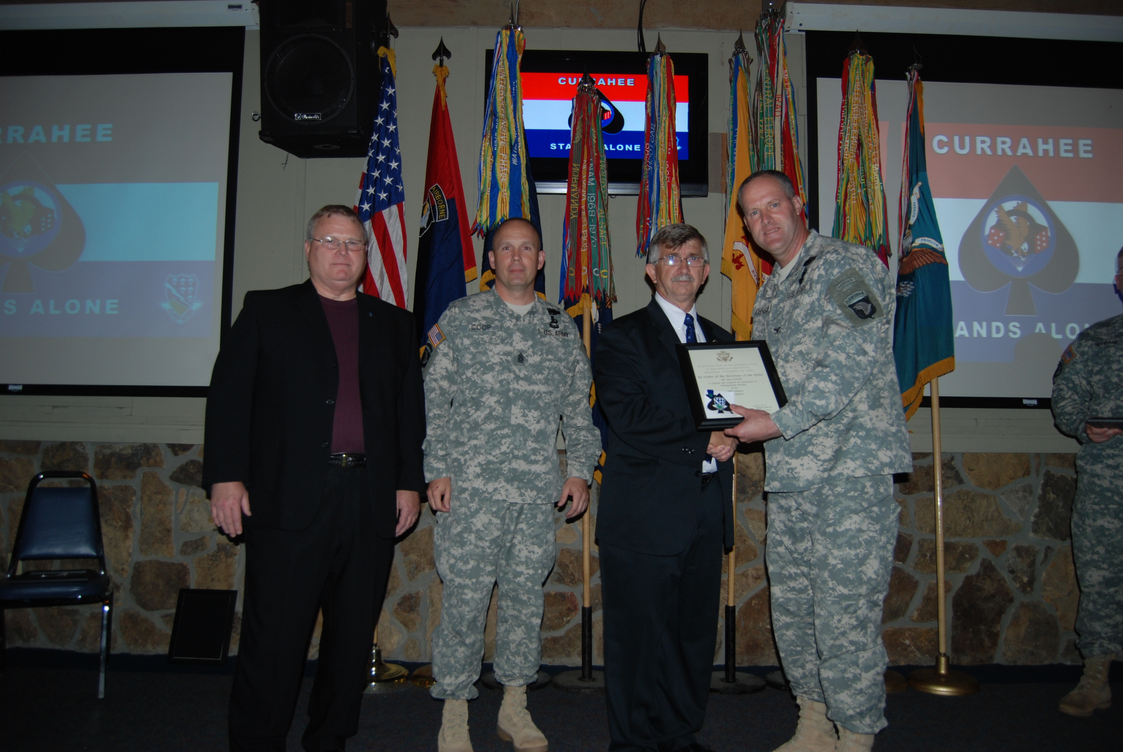 When each person received their award, they would turn to the room of people before them, and callout "Currahee" and the entire room would answer "Stands Alone". This was a very moving and emotion filled evening for everyone that was there. Now, maybe you can see why that simple roadsign in the previous picture meant so much to me. Just being there and feeling what the Currahee history and tradition means to today's soldiers as well as the retired soldiers was overwhelming.