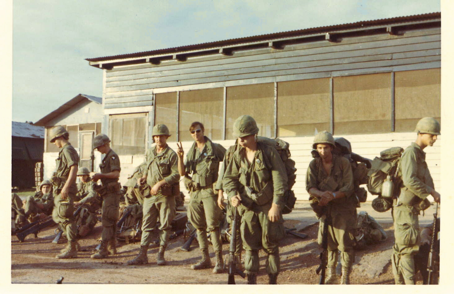 Charlie Company, 1st Platoon rucking up in the company area after a Stand-down. Getting ready to head down to the chopper pads for a CA back into the bush.