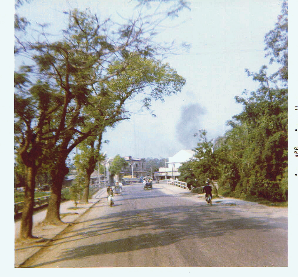 View down a city street in Hue'. The smoke in the background is a "Napalm Air Strike" on some activity going on just outside the city.